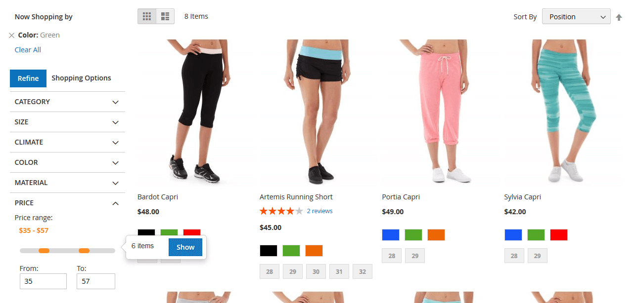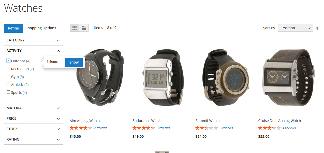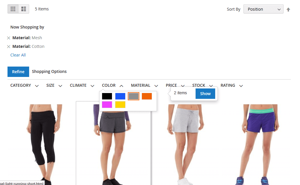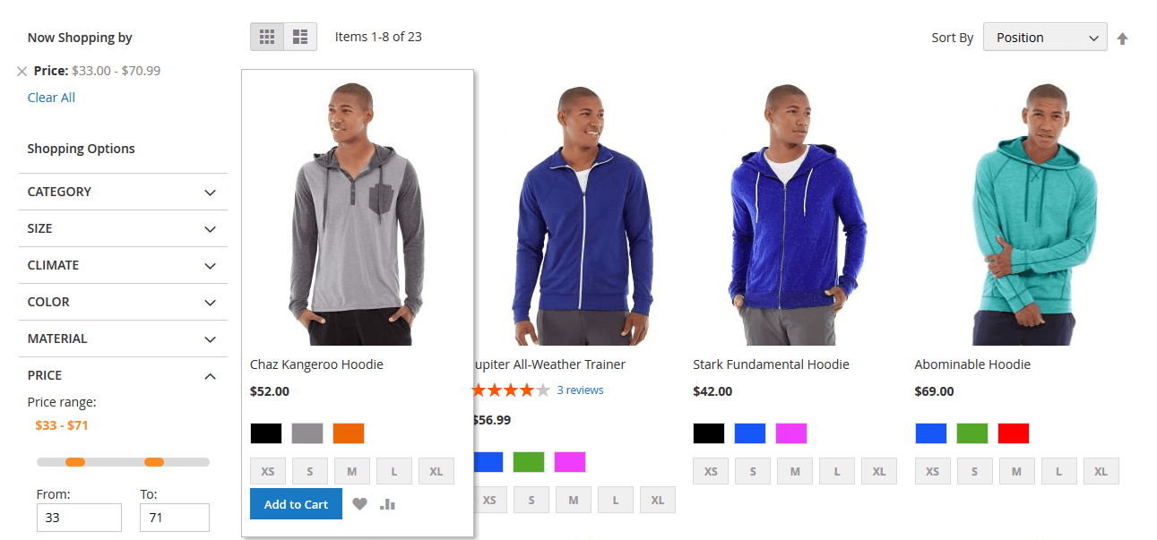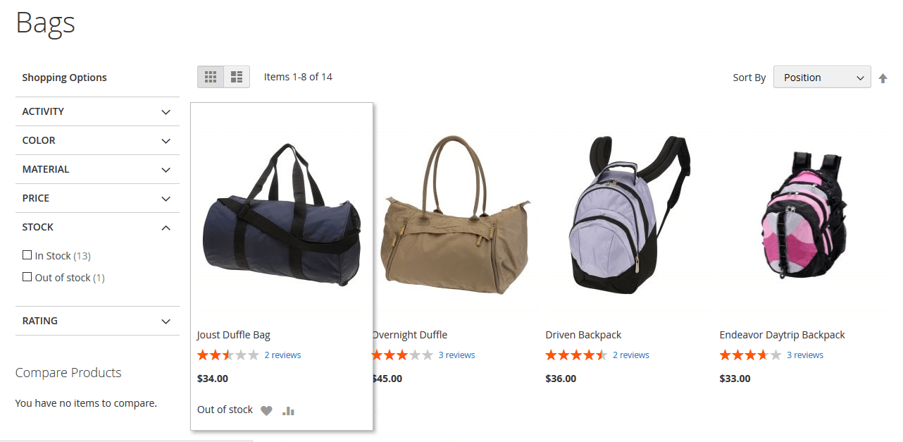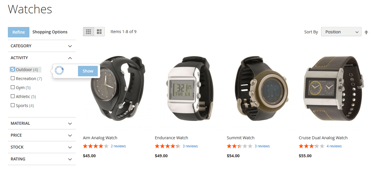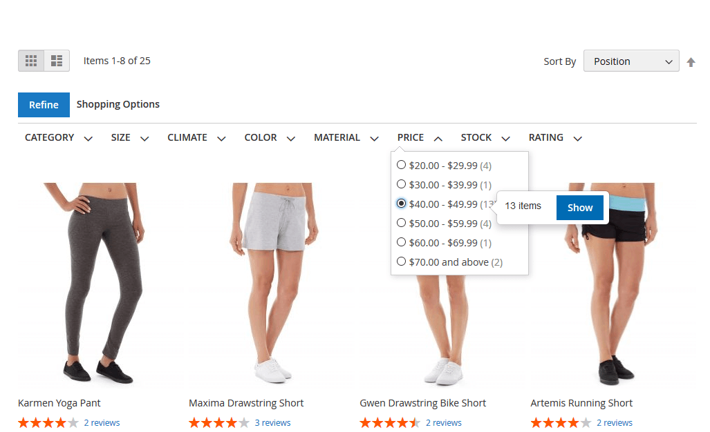 Using backend options, the admin can choose from various available product filters that he or she wants to display in frontend product category and search results page. You can also customize the product filter position, such as horizontal or vertical, on the search page. If the admin has enabled the stock filter option, then your shoppers will also be able to quickly filter products that are currently in stock or out of stock with in the same search results. Not just that, if your customer wants to start a new search, then they can remove all the selected product filter options and can begin again. Ultimately adding such product filter options will help customers to meet their requirements by saving their lots of time & effort.
