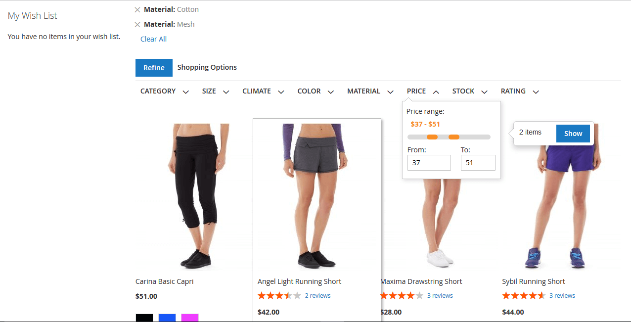 The filter by price functionality offers the customers to choose the price range either by the slider bar or manually enter the price range. In the slider bar, the minimum and maximum amount is automatically taken by the system based on the products with lowest and highest cost.