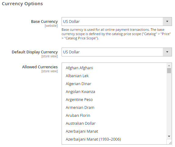 - Allowed Currencies: Here, you can select multiple currencies which you wish to allow on your store. For selecting multiple currencies press Ctrl button from your keyboard and select the options from the list.