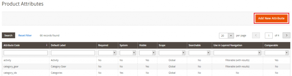 Navigate to Stores > Attributes > Products. The Products page will open up. Click on Add New Attribute button.