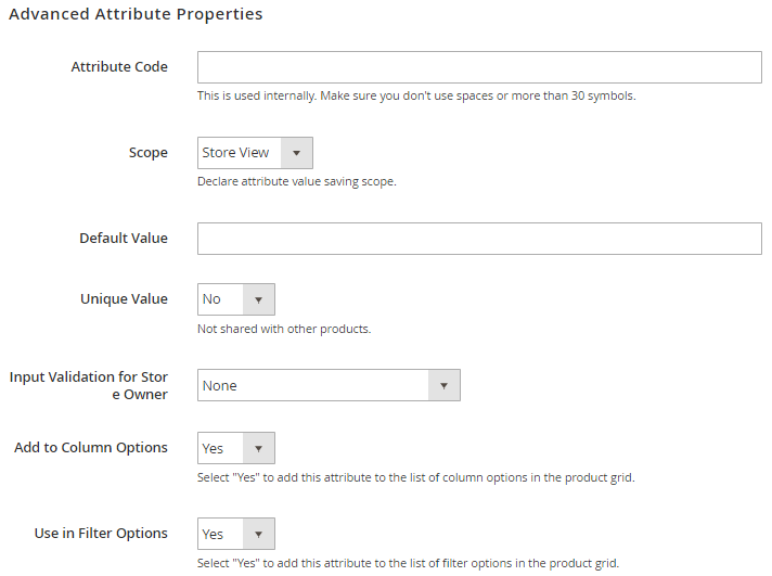 - Attribute code: Enter the code for the attribute which is not more than 30 characters excluding the space.
