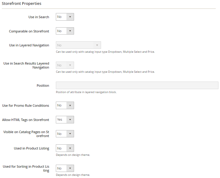 - Visible on Catalog Pages on Storefront: Select yes to make the attributes visible in the catalog listing pages on the storefront.