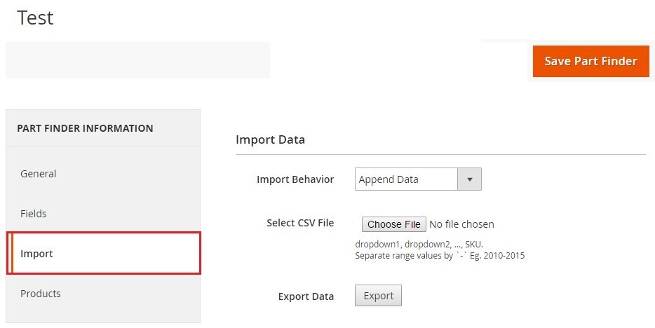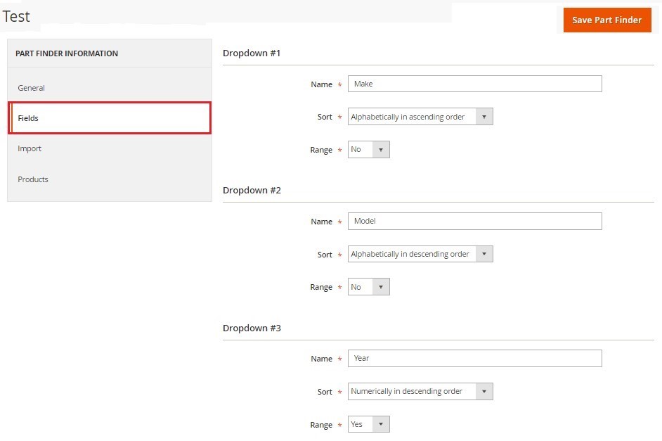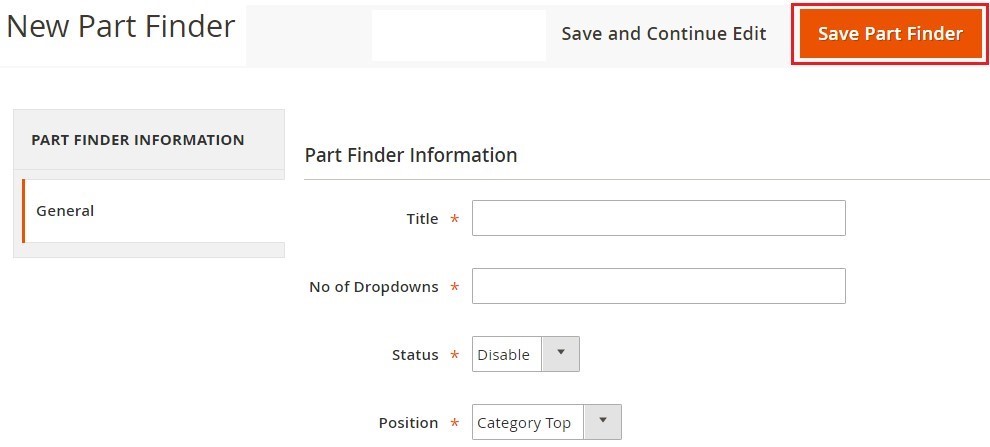 3. On the user interface, you will find a big button ‘Add Part Finder’ on the top-right of the page. Just click on the button, it will lead you to a ‘New Part Finder’ dialog box where the Magento merchants have to fill up the required information, such as