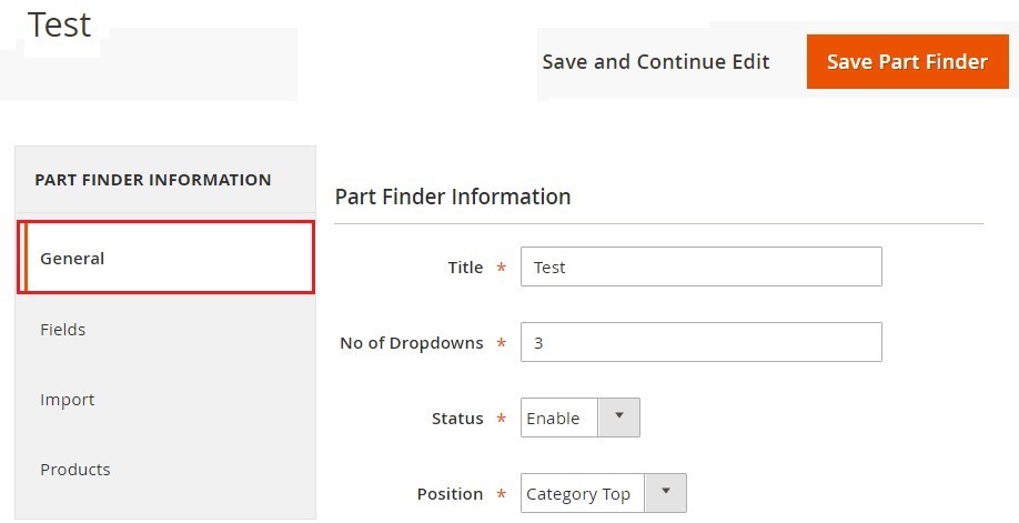 5. It consists of following fields to provide the general info regarding the Part Finder Extension module.