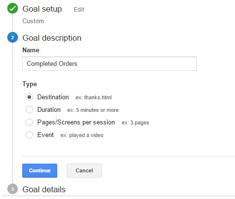 Now, select Custom to create your own. Name your goal that you wish to such as (Completed Orders). For cart abandonment, select destination in Type. After selecting this check box go to the next step.