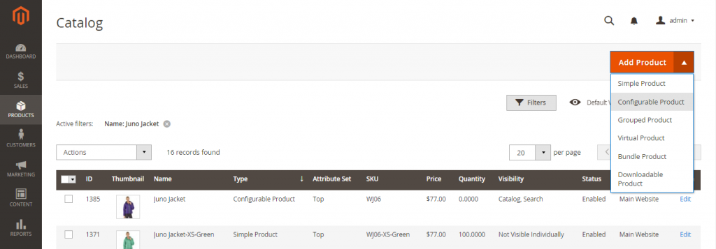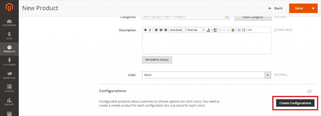 - Go to ‘Product’ > ‘Catalog’. Click on ‘New Product’ drop-down and select ‘Configurable Product’