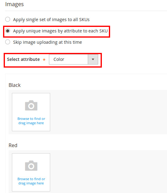 - Apply unique images by attribute to each SKU: This will allow you to add each unique image in all products.