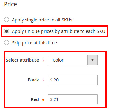 - Apply unique prices by attribute to each SKU:This will allow you to add each unique price in all products.