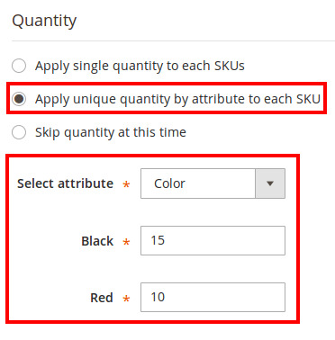 - Apply unique quantity by attribute to each SKU:This will allow you to add each unique quantity in all products.