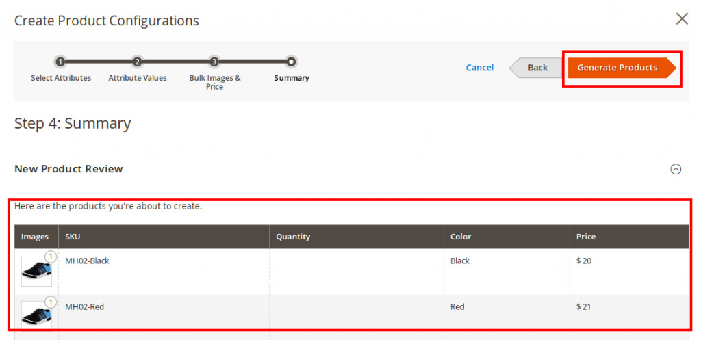For Example: If you have selected two attribute values like Black and Red, then two products will be created. You may now define their respective images and price from this screen.
