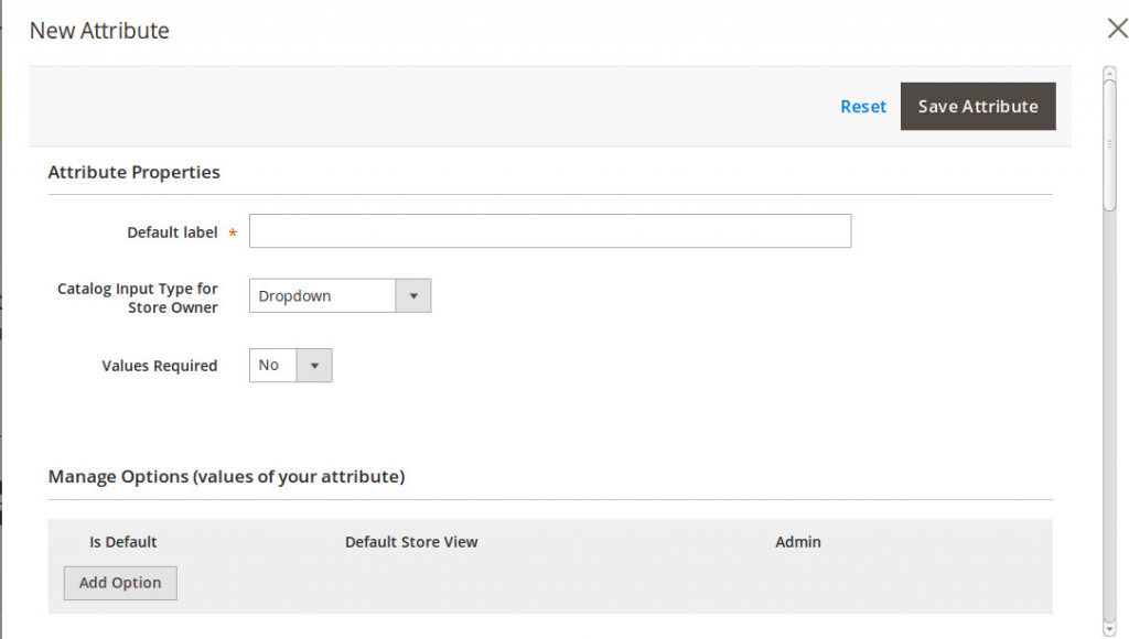 - Default label: Enter the name of the attribute that you want to assign to a product. (Ex: Color, Size).