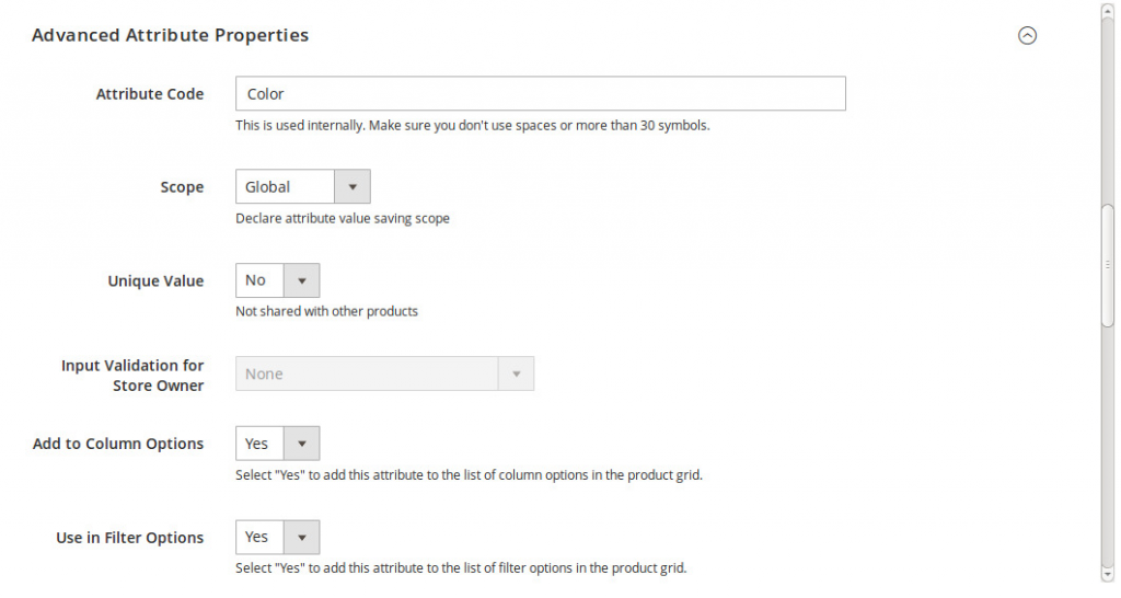 - Attribute Code: This is a mandatory field for internal use. The code can be named using letters (a-z), numbers (0-9) or underscore (_) and the first character should always be a letter.