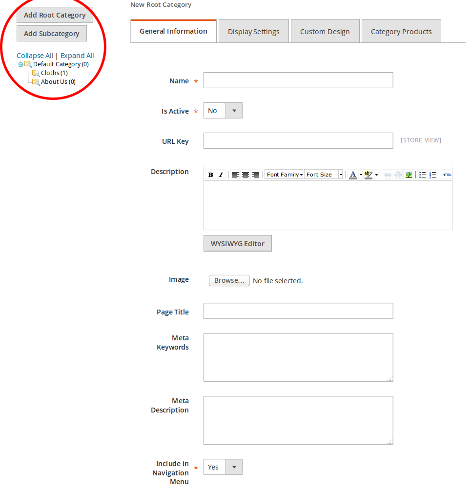 If you want to add root category, click on root category button OR if you want to add sub category for the existing category then first select category from existing list and click add subcategory button.