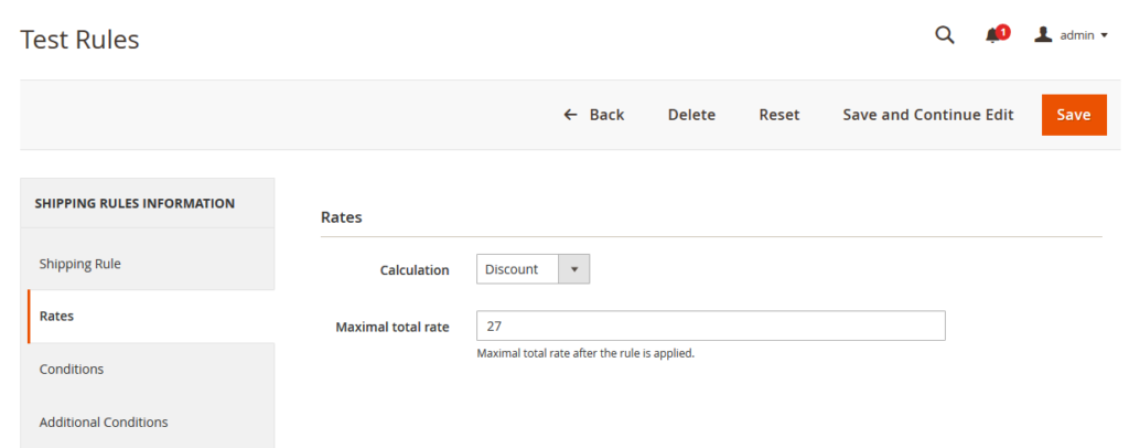 • Calculation – It has three options: replace, surcharge and discount. Replace will change the shipping charge to the value entered in “Maximal total rate” field. Surcharge will add the value to the existing shipping charge. Discount will subtract the percentage entered from the existing shipping charge.