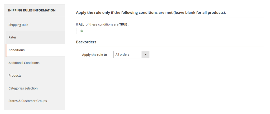 • Apply the rule to – Here you have three options whether the rule is to be applied to all the orders, only backorders or orders except backorders. Choose appropriately. Conditional Settings