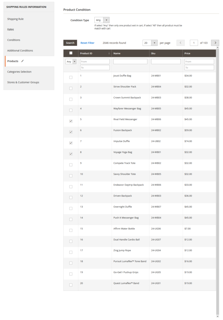 • Condition Type – There are two options: “Any” and “All”. If you want the rule to be applied if any of the product selected is added to cart, then select the option “Any”. If you want the rule to be applied only when all the products selected are added to cart, then select “All” as condition type.