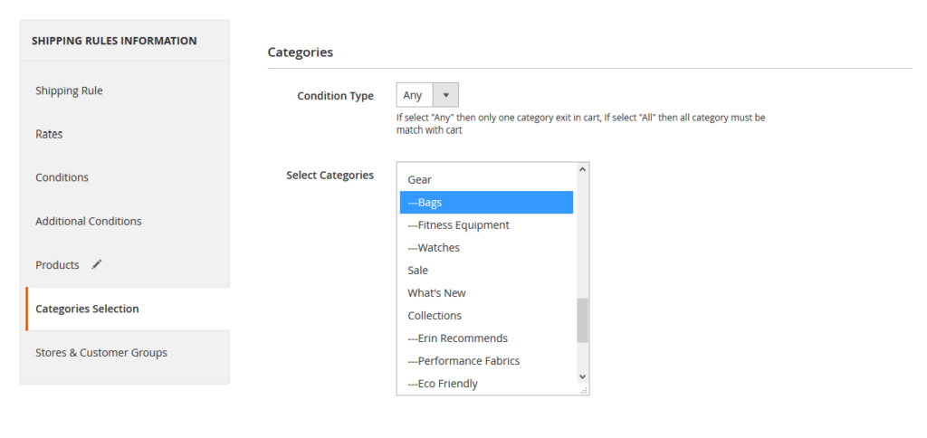 • Condition Type – There are two options: “Any” and “All”. If you want the rule to be applied if product of any of the selected category is added to cart, then select the option “Any”. If you want the rule to be applied only when all the products of selected category are added to cart, then select “All” as condition type.