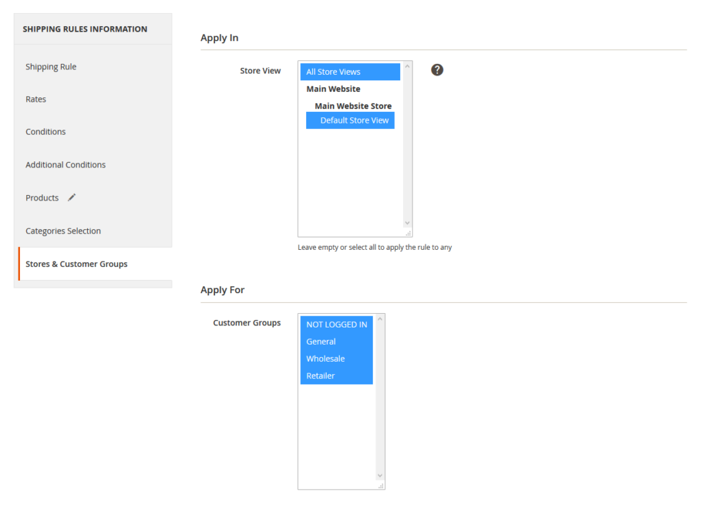 • Store View – Select the store view/s in which the shipping rule is to be executed. You can select “All Store Views” as well.
