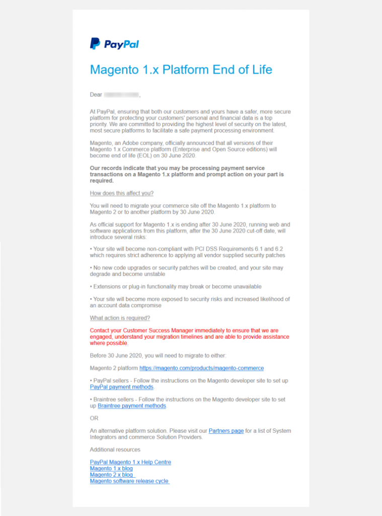 It also sent an email to Magento 1.X merchants about the implications of staying with the platform after the EOL date. The mail went on to say action required by the merchants to stay out of risks and comply with PCI DSS guidelines.