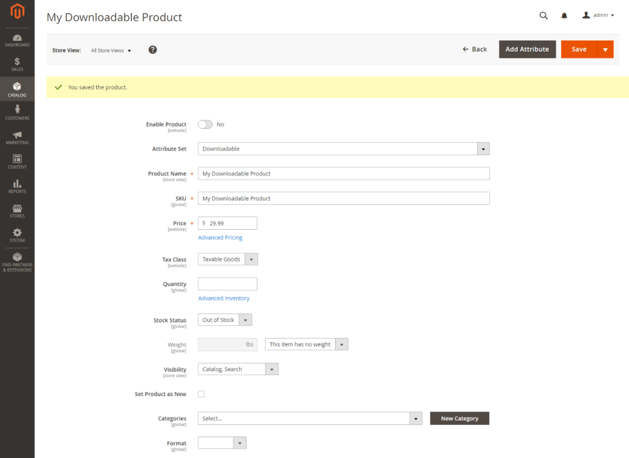 Let the visibility setting stay the default one, assign the category or create a new one, and select the format of the product as download or DVD. If you want to feature the products in the new products list, then click on the checkbox of Set Product as New. You can edit attributes to have more custom fields to add more details.