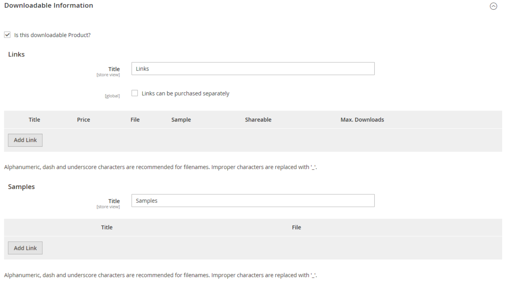 Expand the downloadable information section to configure the settings of the product. First, click on the checkbox of Is this downloadable product? Next, the section is divided into two parts. The first part deal with the download link and the second part deals with the sample file.