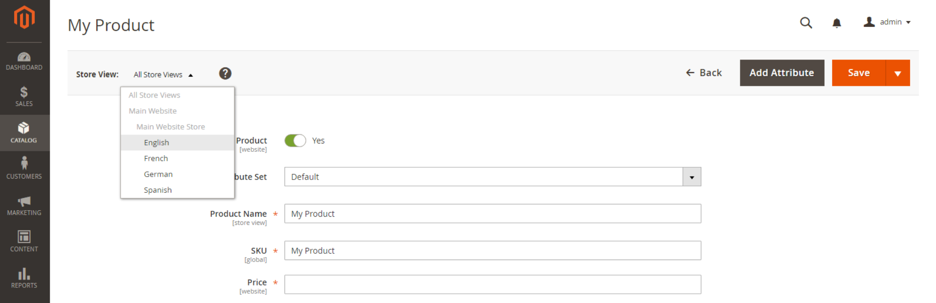 Now enter the necessary detail of the products such as Product Name, SKU, and Price. At the top left corner, select the store view where downloadable products will be available. Once done, click and save the products.