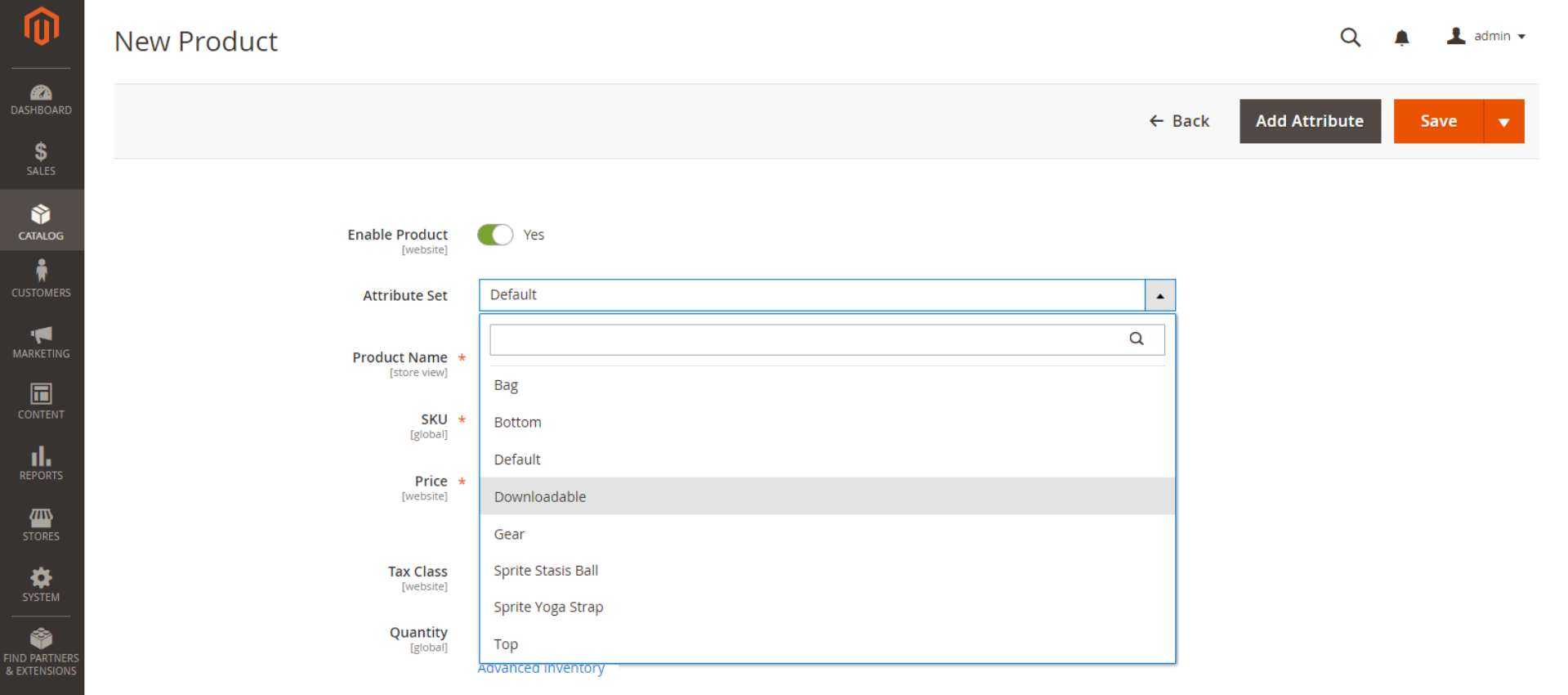 On the next page, you can enable and disable the product type. Now the sample data of product type has an attribute set called downloadable that includes special fields. Use an existing template or create another one to choose the attribute set. You can either search for the downloadable attribute type or choose from the list as shown in the below image.