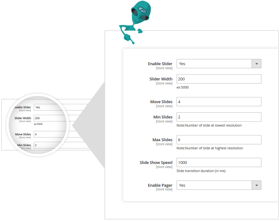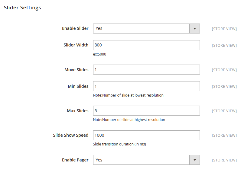 Then you can set the Slider Width, Move Slides, Min Slides (at lowest resolution), Max Slides (at highest resolution), Slide Show Speed and Enable Pager.