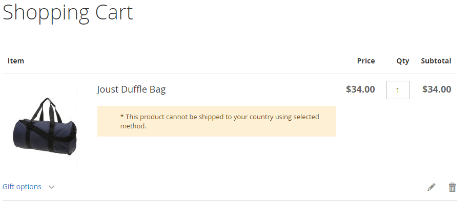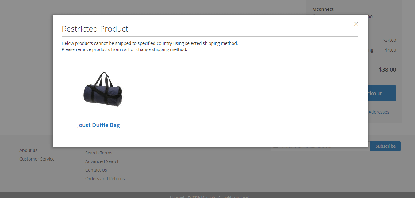 You can enter a message which will appear on the shopping cart page or checkout page, when the selected products or selected countries will not be applicable as per the configuration.