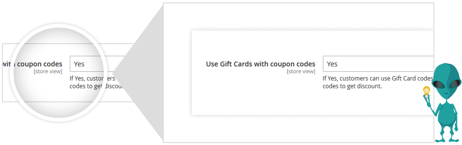 If you want to allow your customers to use Gift cards along with coupon codes, select "Yes". If selected "No", a customer will not be able to use Gift card and Coupon code at the same time.