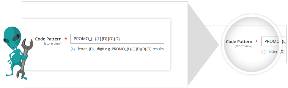 To set code pattern use custom string and notation of latter {L} and notation of digit {D} Eg: DEMO_{L}{L}{L}{L}_{D}{D}{D}{D} It will generate code like Demo_SHKI_1389