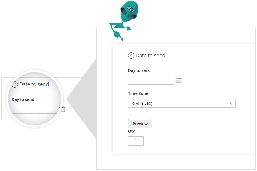 This option allows to select date when gift card will be sent. Time zone: If date is specified then need to specify time zone so according to that time zone date, card will be sent. Preview: This preview button will generate preview of card. You can send multiple cards of same recipient by enormous quantity.