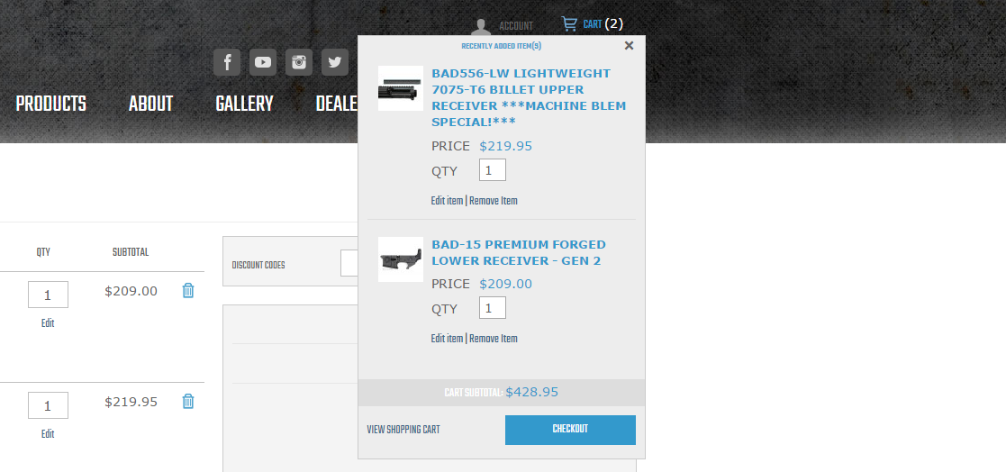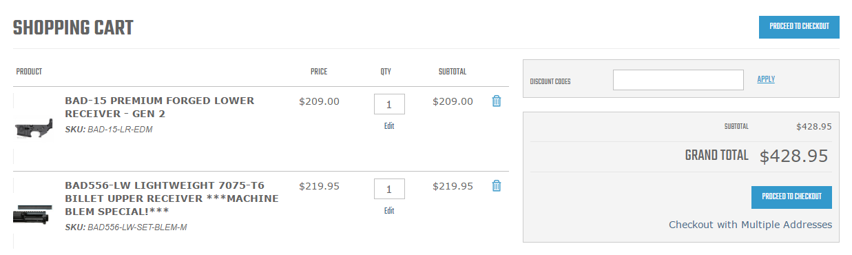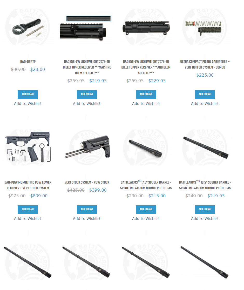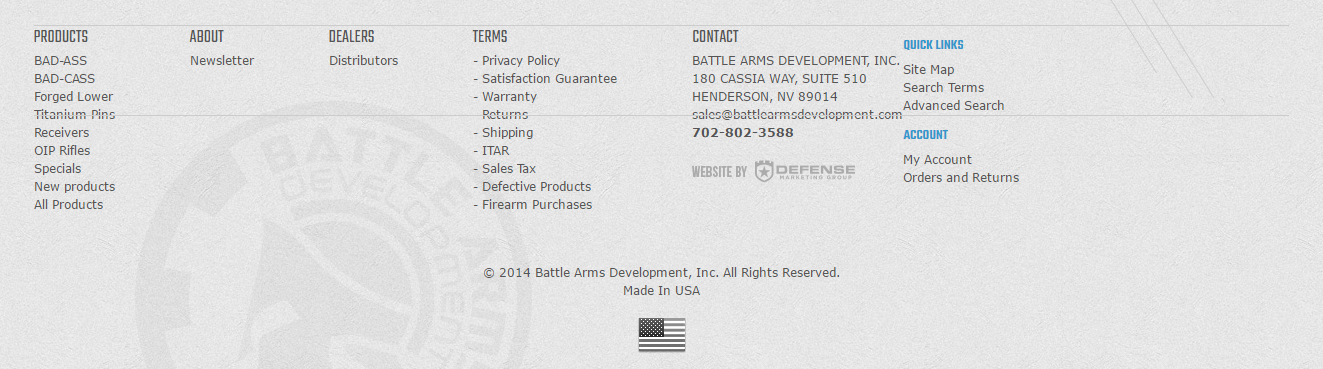 It is a Magento 1 ecommerce store for ‘B.A.D. Inc.’ design, research, and development firm selling small arms design including firearm components, tools, gauges, accessories, and complete weapon systems online & offline.