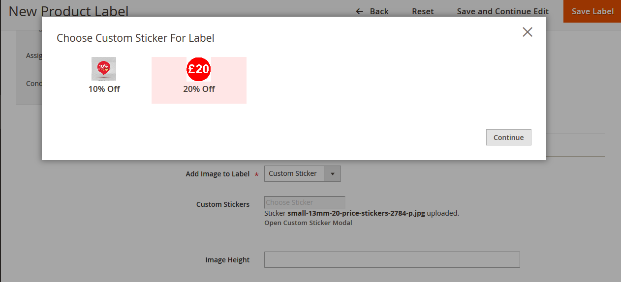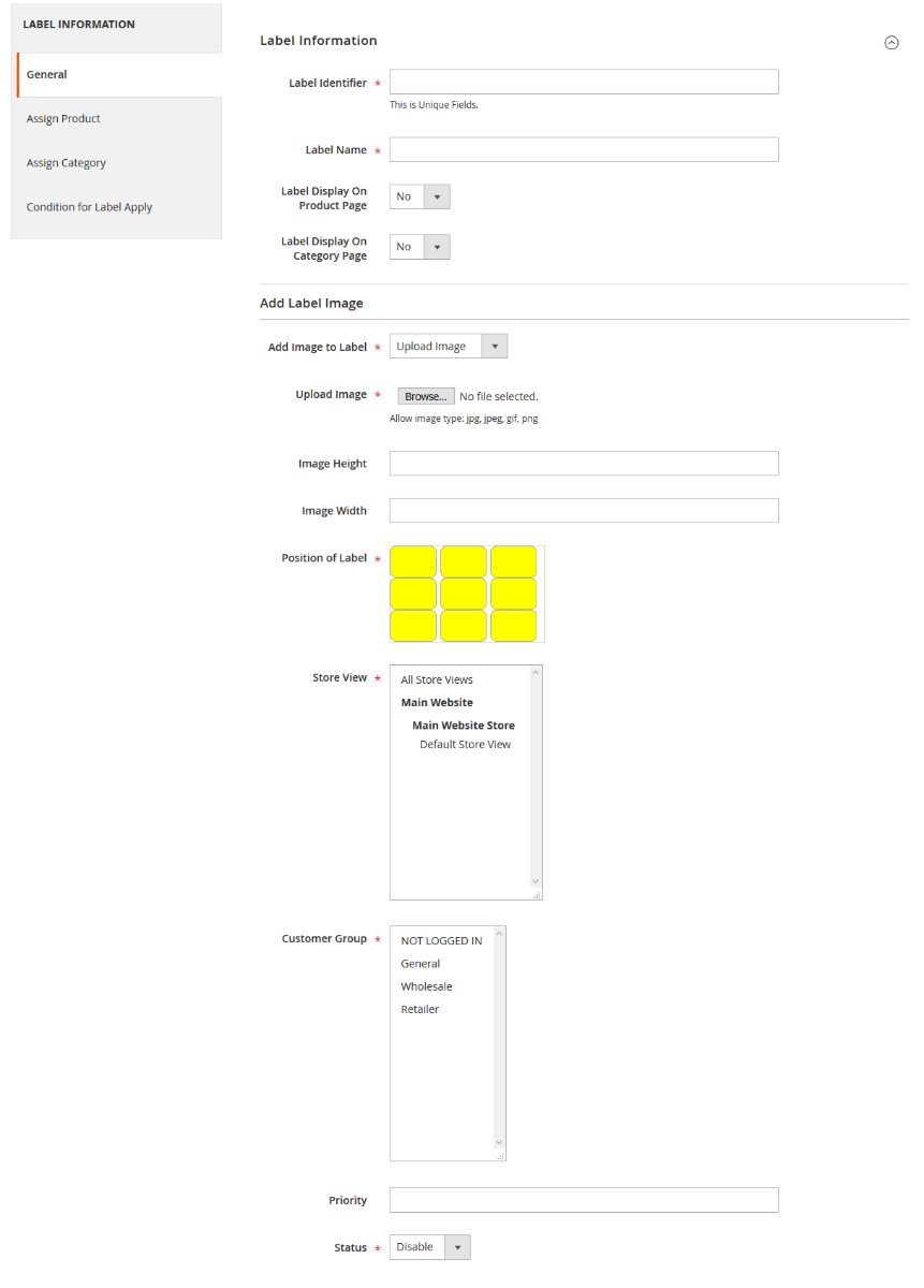 Upload image or choose from library, set its height, width and position on the product image. Select applicable store views, customer group and set the priority of the label.