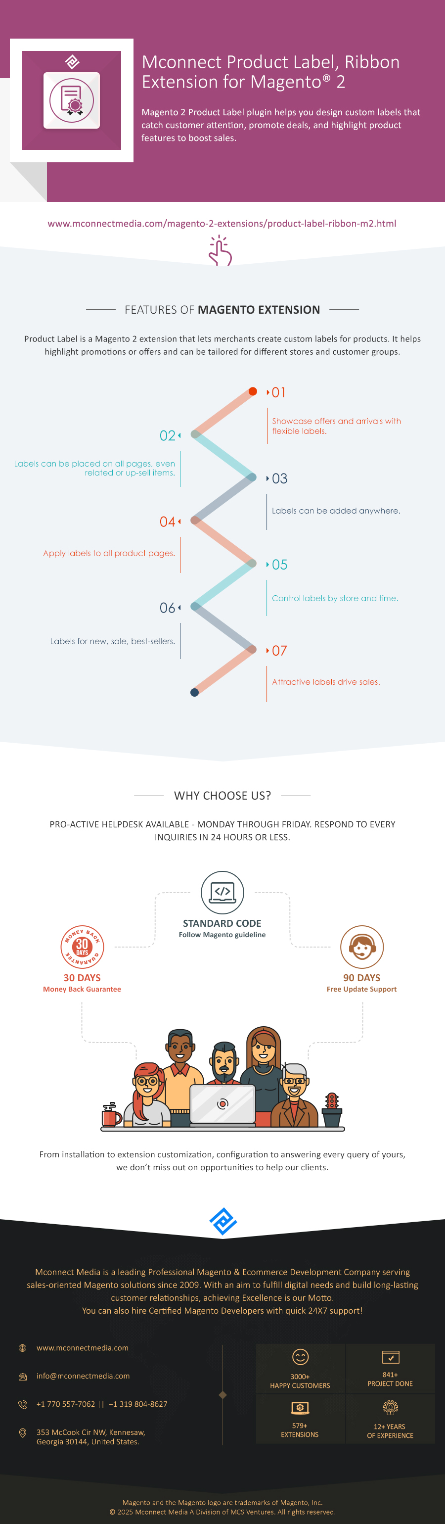 Mconnect Product Labels Extension for Magento 2 helps you to add clear and engaging fancy product labels that convenience your customers to purchase those products. Consider these product labels as a promotional marketing tool to create customized colorful product ribbons like ‘Best Seller’, ‘Limited Edition’, ‘Most Popular’, ‘On Offer’, ‘Top picked’, etc. You can also use these product labels to notify your customers about low stock or coming soon products.