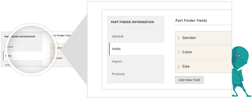 With the Add New Field and Delete button on the Field information page, you can delete any of the part finder field and add a new one as per your requirement.