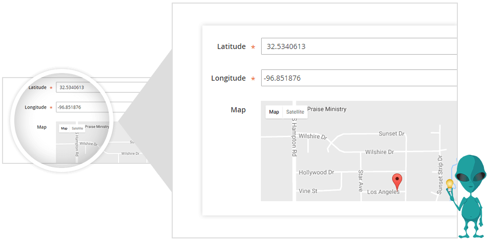 This will find your store online and will display it on google map with Latitude and Longitude details. The extension also allows you to change the pointer location on map if you find the location is not correct.