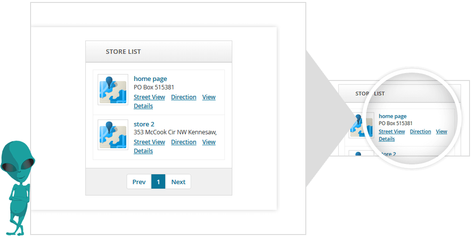- Display Store Location on friendly user interface: The customers can view the store locations on both list and map. There is a View Details link as well as an external link of the store.